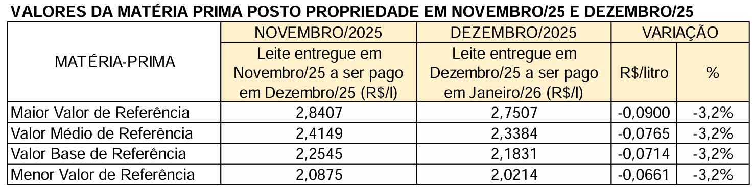26 de janeiro de 2026 (a partir das 16h) - Valores Parciais* de Referência para o leite entregue em Janeiro/26 a ser pago em Fevereiro/26.