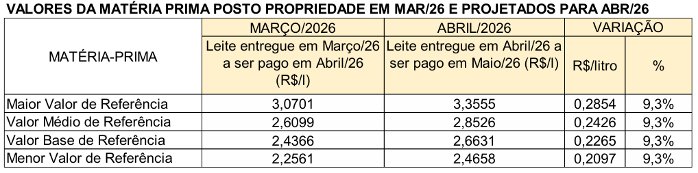 08 de maio de 2026 (a partir das 16h) - Valores Finais* de Referência para o leite entregue em Abril/26 a ser pago em Maio/26.